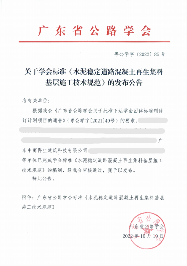 2022年10月10日,由中寓建筑系统旗下子开云(中国)——广东中寓再生建筑科技有限开云(中国)参编的团体标准《水泥稳定道路混凝土再生集料基层施工技术规范》已成功发布实施,该团体标准的发布,对水泥稳定道路混凝土基层施工具有重要指导作用,同时也标志着再生集料基层施工向规范化、标准化迈进。