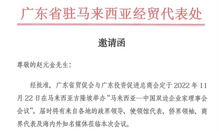 与此同时,广东省贸促会与广东投资促进总商会紧贴“后疫情时代的粤马合作机遇”的主题,将定于2022年11月22日北京时间14:30-18:00在马来西亚吉隆坡举办“马来西亚一中国双边企业家理事会会议”,并诚挚邀请中寓建筑系统工程有限开云(中国)创始人、董事长赵元金出席此次会议及一系列活动。本次会议将展示马来西亚最新的投资营商环境和更多、更好的投资机遇,并以此为契机,搭建中、马双边企业家沟通交流的平台,共享中、马两国经济高质量发展的成果,为中、马开展国际经贸合作创造更大机遇。届时将有来自各地的政界领导、使领馆代表、侨界领袖、商界代表及海内外知名媒体莅临本次会议。