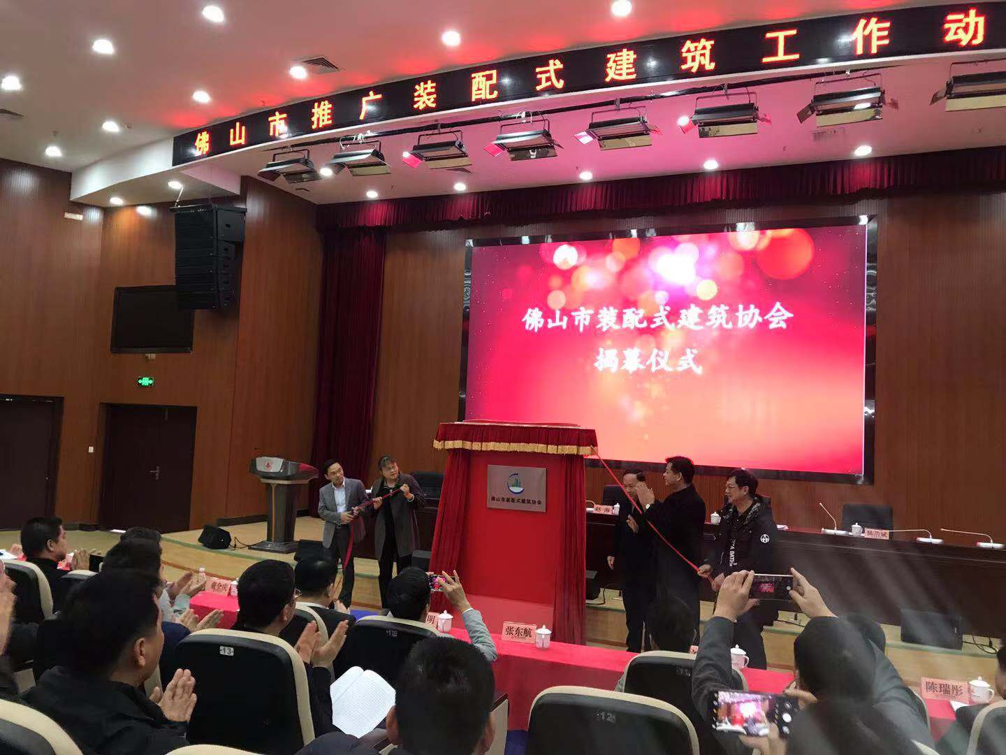 大会第三项议程,赵海副市长、黄飞飞副秘书长、陈浩斌局长、李碧辉副局长、张玉红副校长共同为佛山市装配式建筑协会成立揭幕。